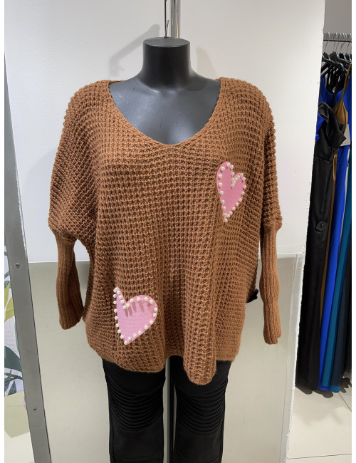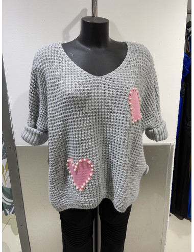TF763 Pull maille 2 coeurs roses avec perles TU36-42